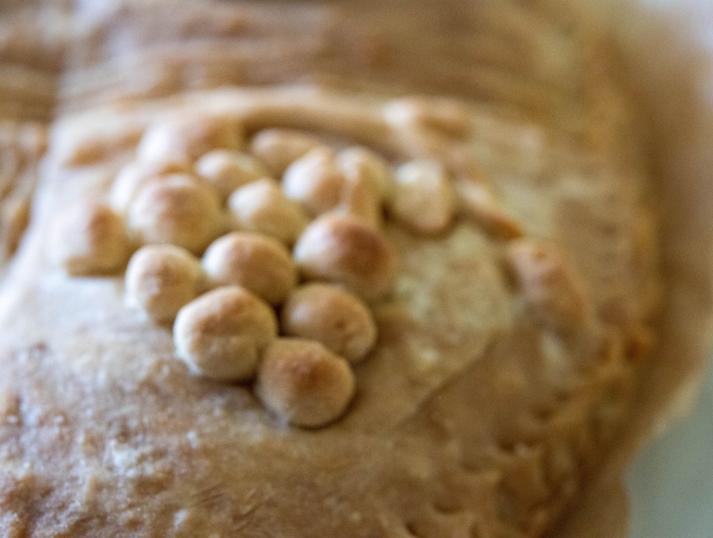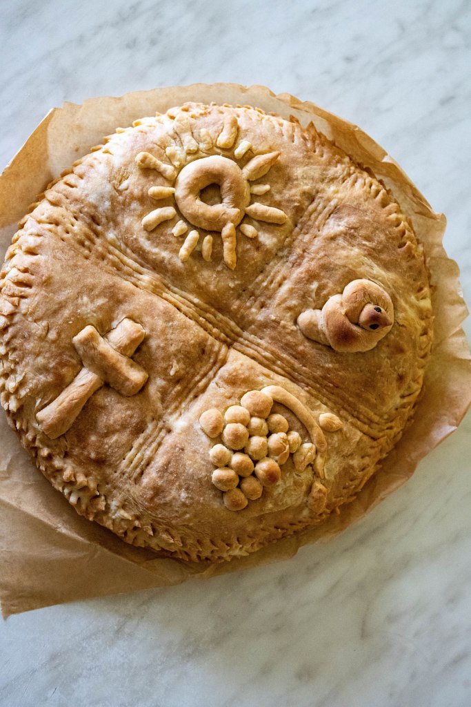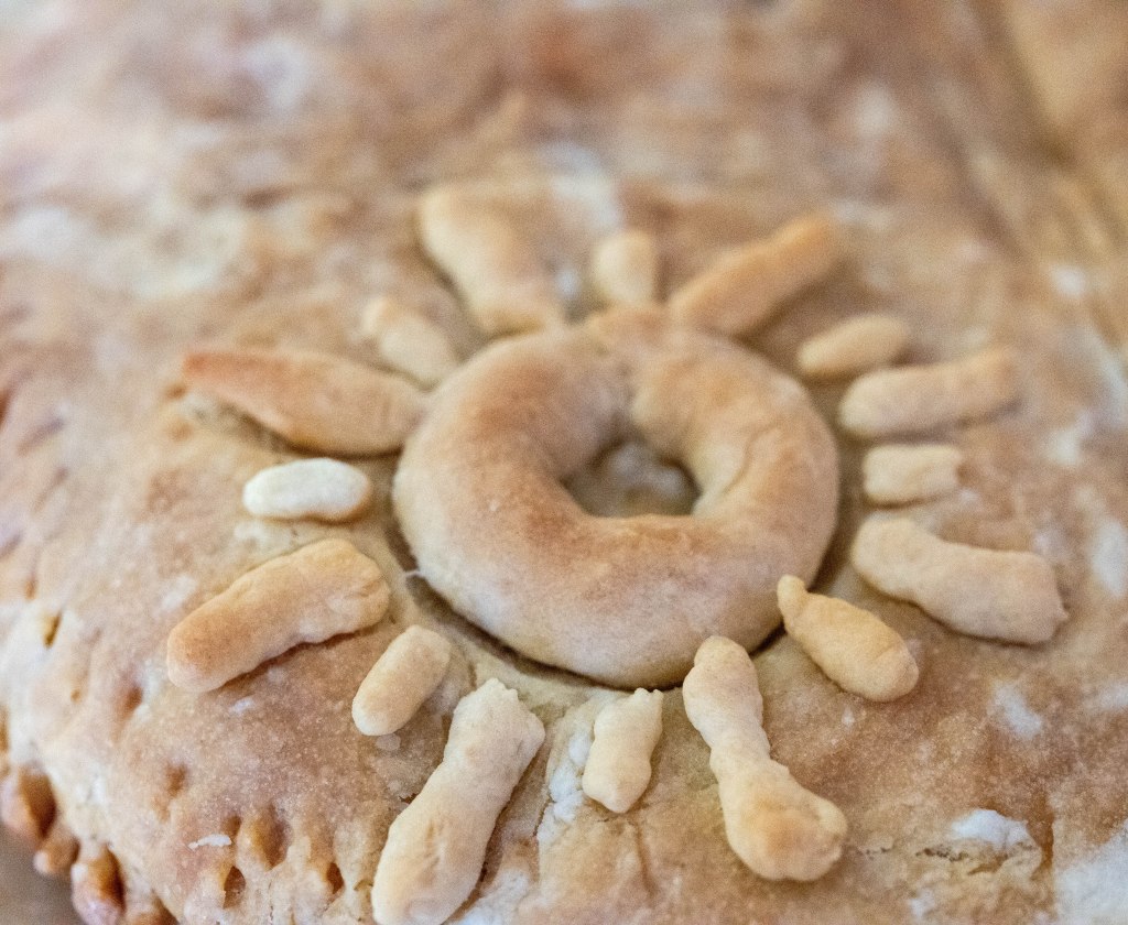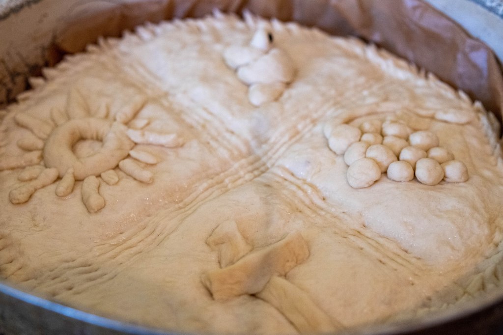 The edge of the bread is decorated with a wheat class, representing the Earth. While kneading in the dough is placed a metal coin representing the iron and for the person who receives the piece with it, is like a wish to be so strong as iron. Usually, the oldest person on the table break the bread into pieces first of which is placed in front of the home icon, the second is for the house and after that, the pieces are given to each person on the table starting from the oldest to the youngest.