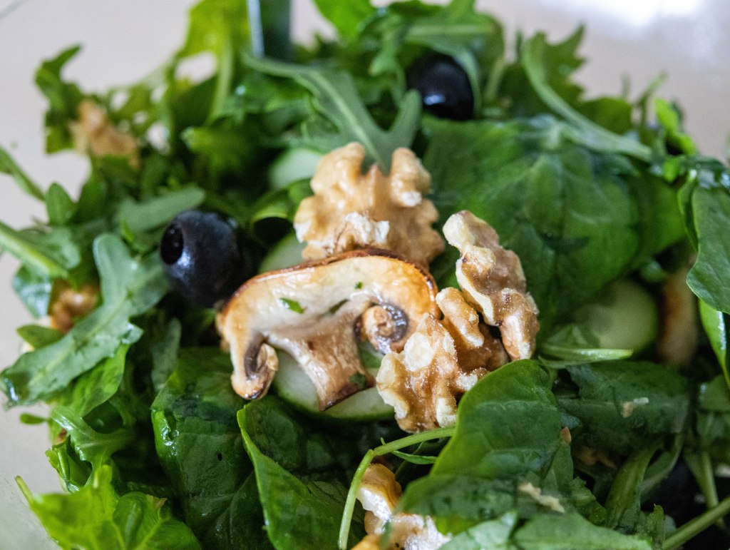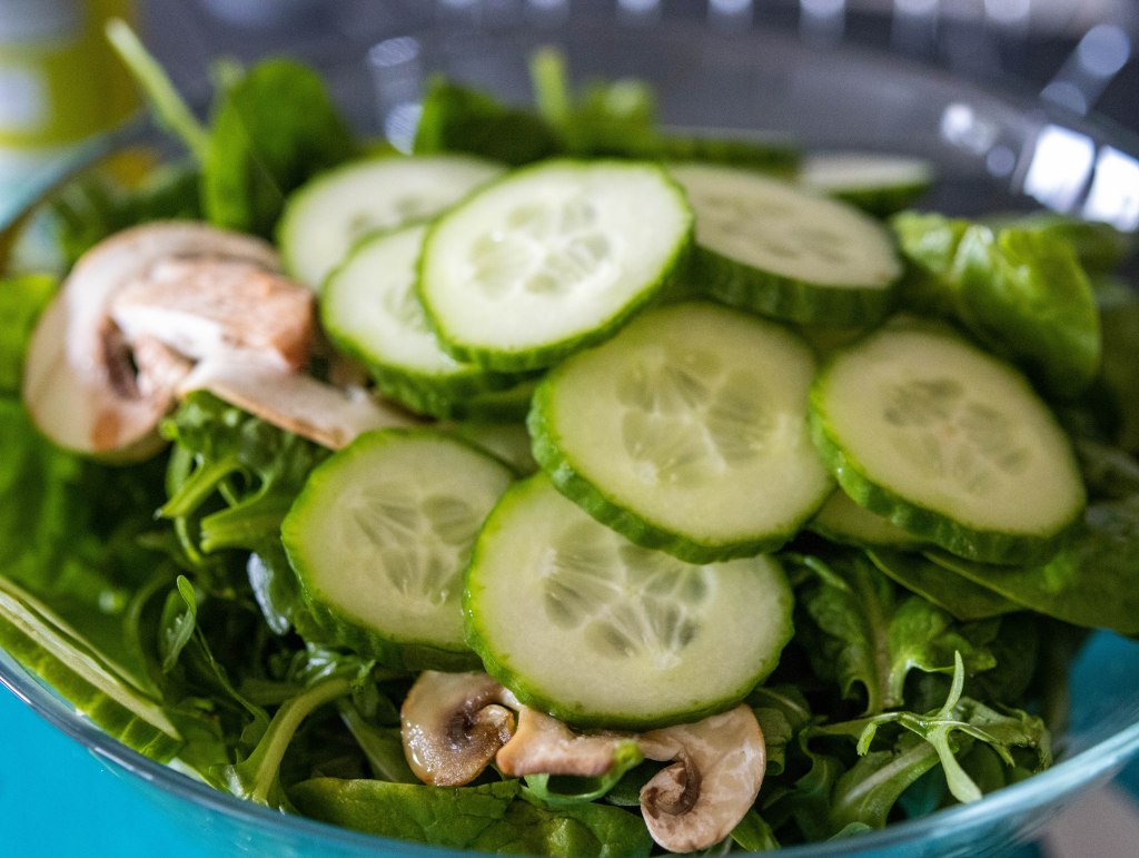 3. Cut the cucumber and mushrooms into disks and add just the cucumber to the salad mix.