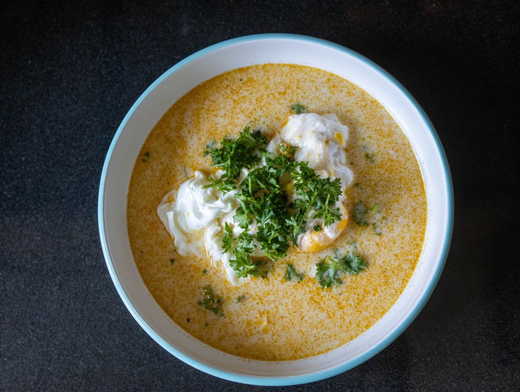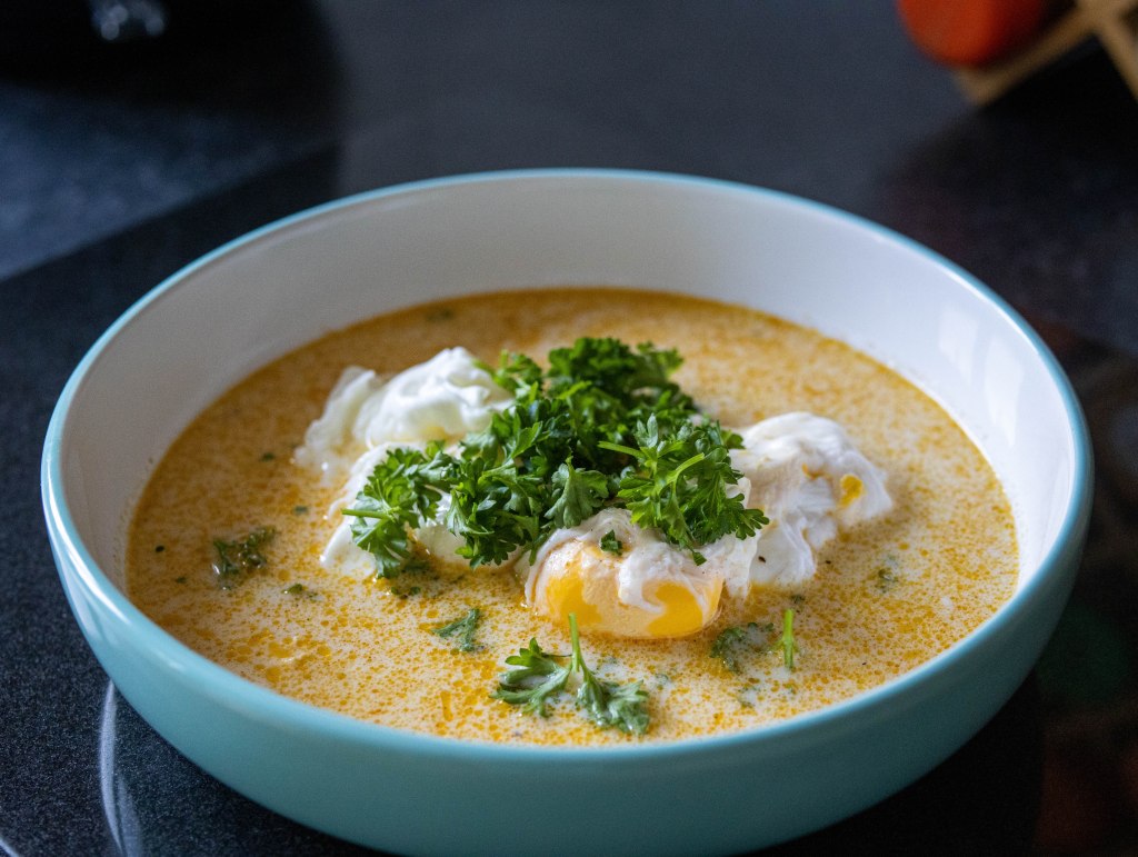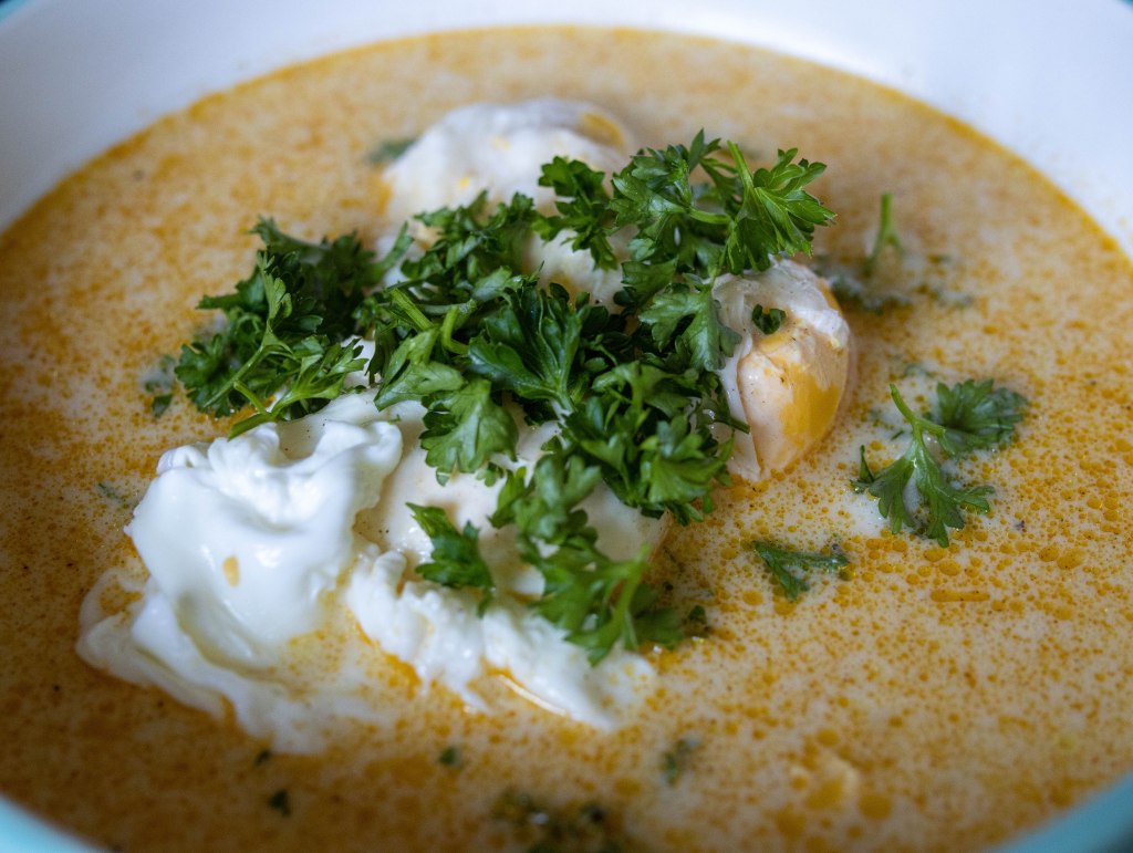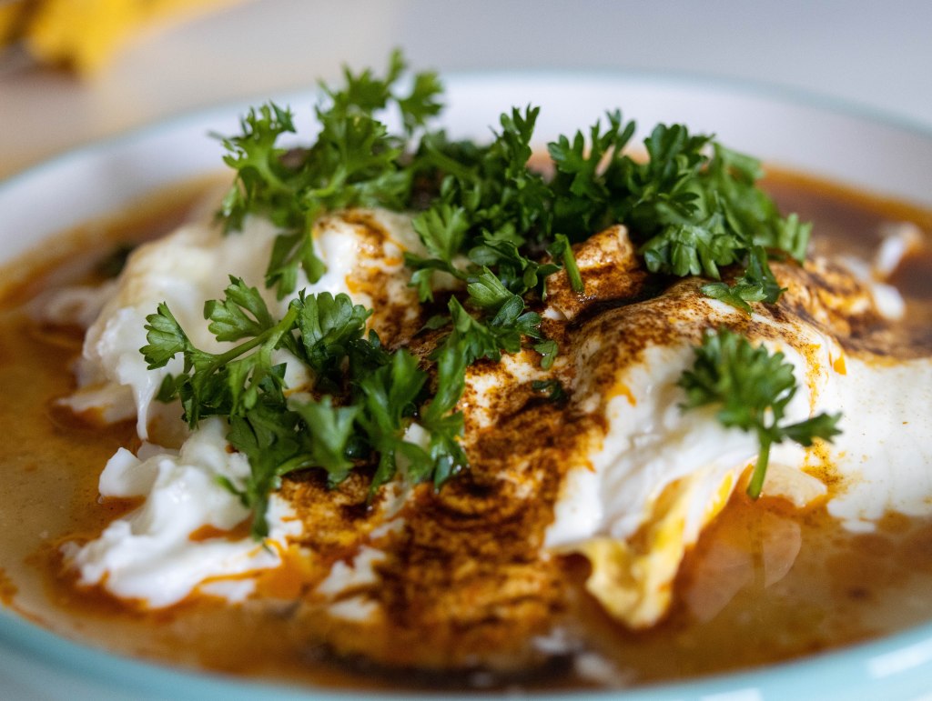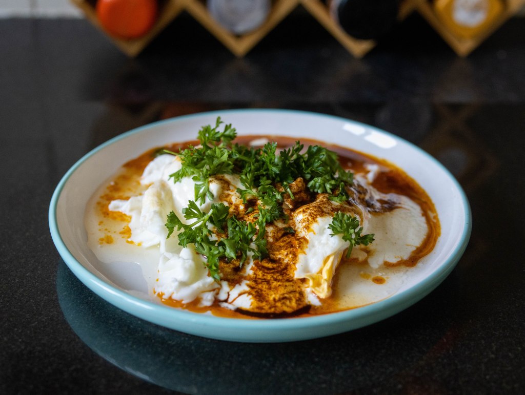 - On the plates with eggs first, add two spoons of yoghurt for each portion