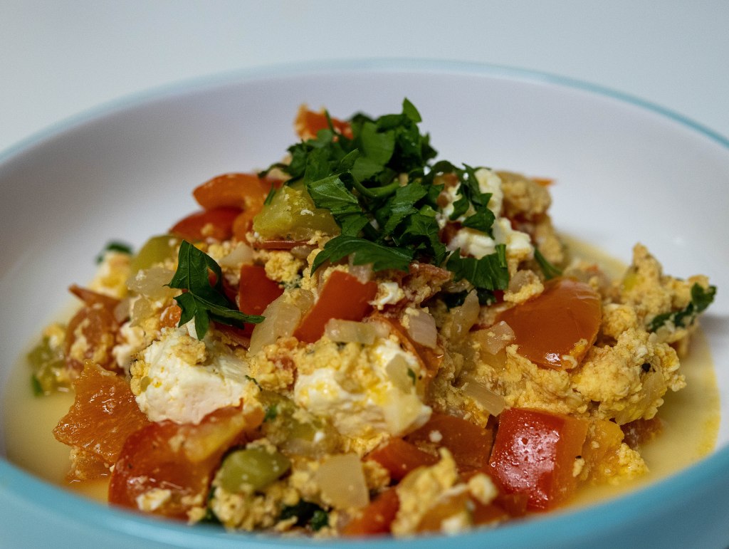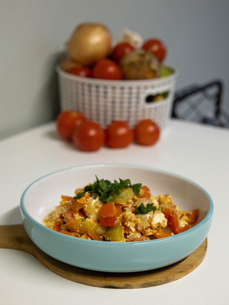 The summer is almost over, or it feels like this here in Ireland. I wanted to cook something summerish and as is kind of tomato season, I went for “Mish Mash”- a traditional Bulgarian dish prepared during the summer months. The name means ‘Mess’ as it looks a bit like a mess and is very quickly made 🙂 There are a few variations in different regions in Bulgaria, but I cooked the one with fewer products 🙂 Additionally to the ones below, you can add zukinni and/or aubergine and in some cases minced meat.