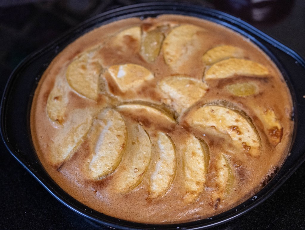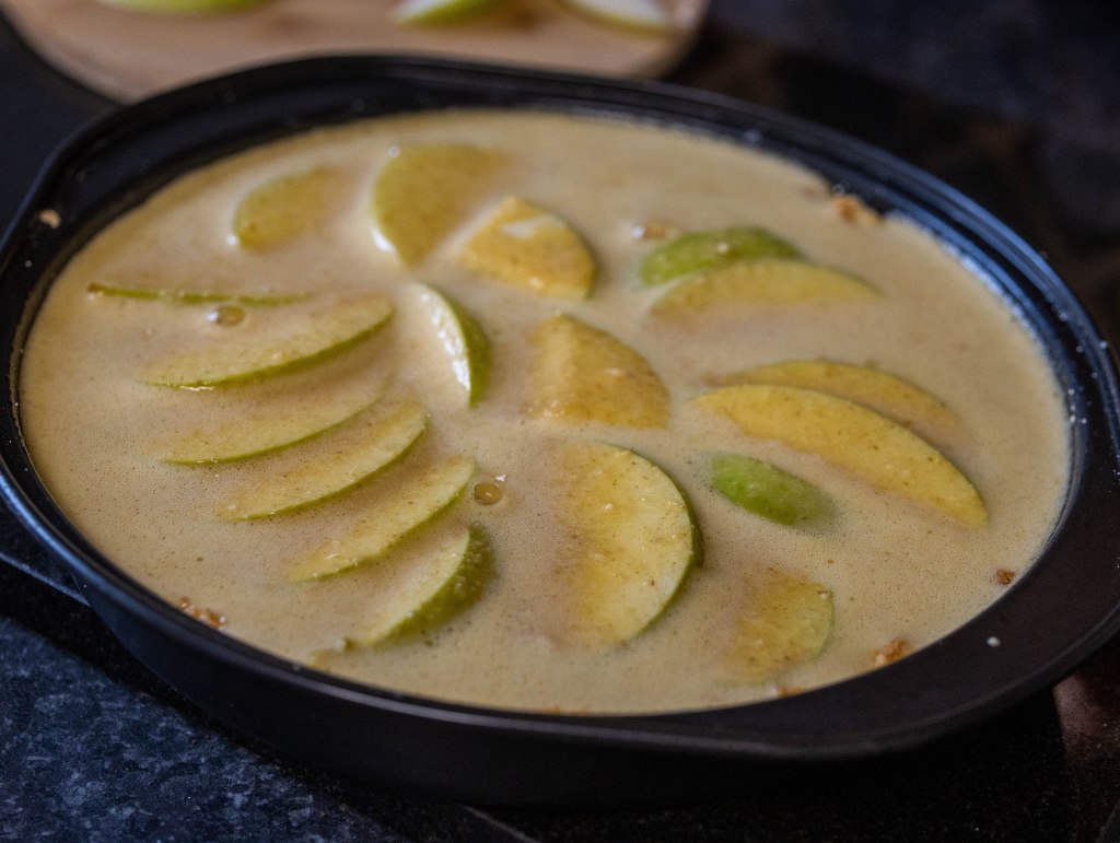 - Take the biscuit base and apples out and cover with this cake mixture.