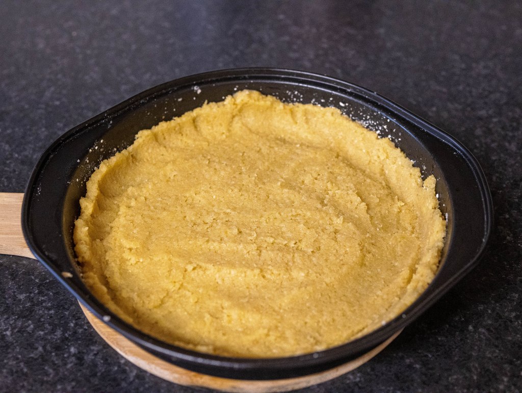 - Place the dough helping yourself with a spoon, try to make it even everywhere, and lifted on the wall sides of the tray.