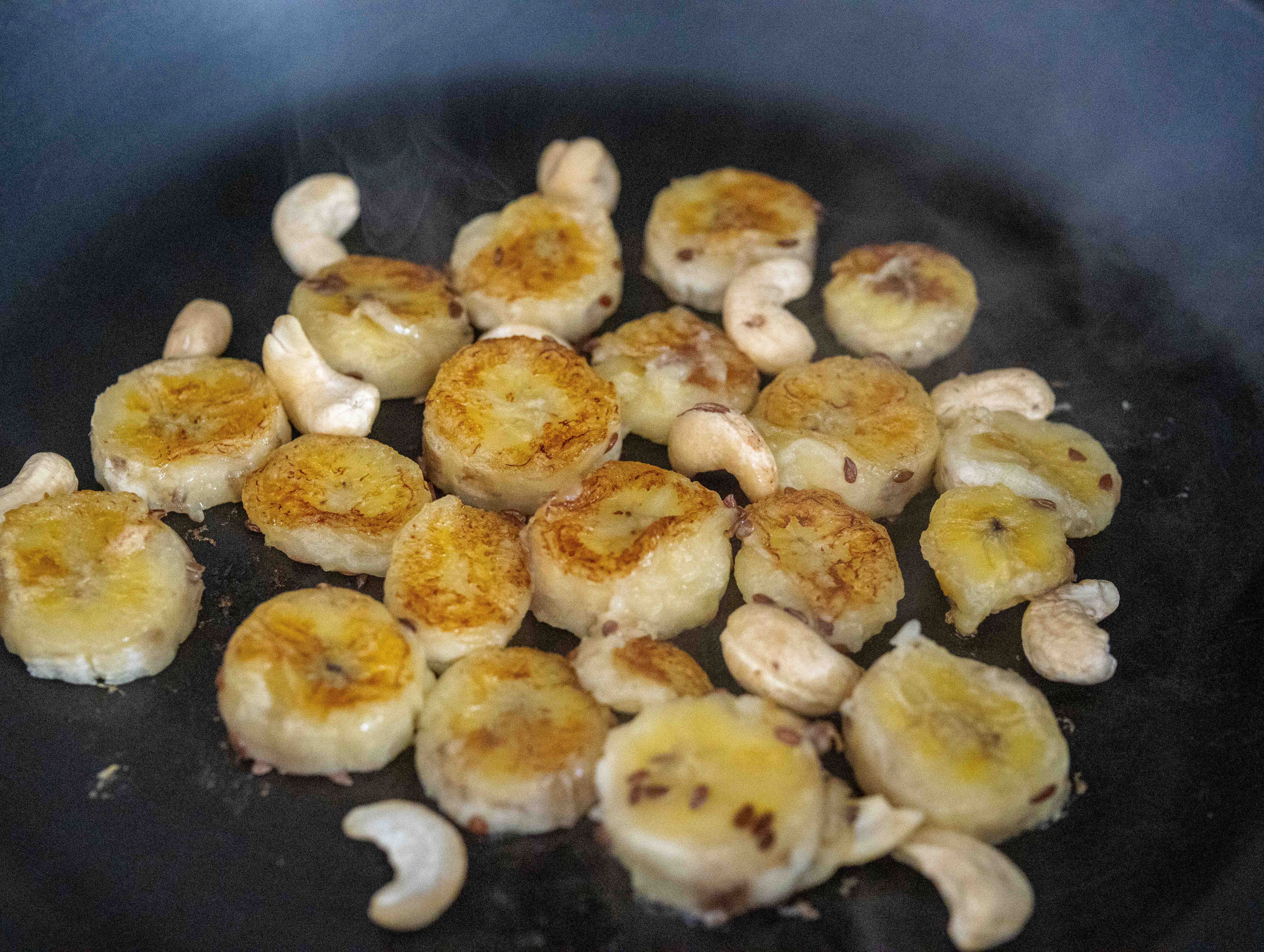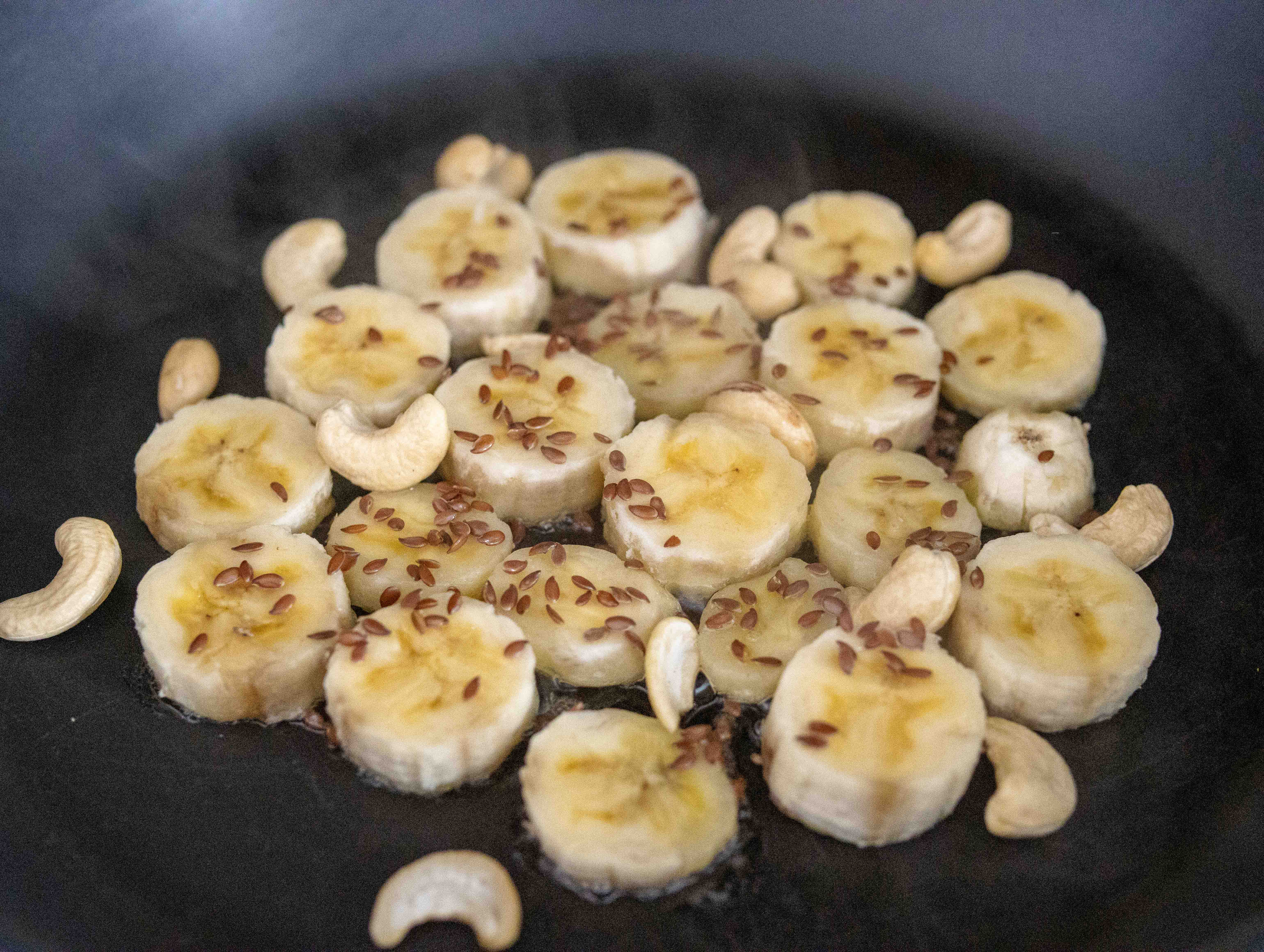 - Place the banana in a circle in the middle of the pan, and add a few of the cashews or walnuts.