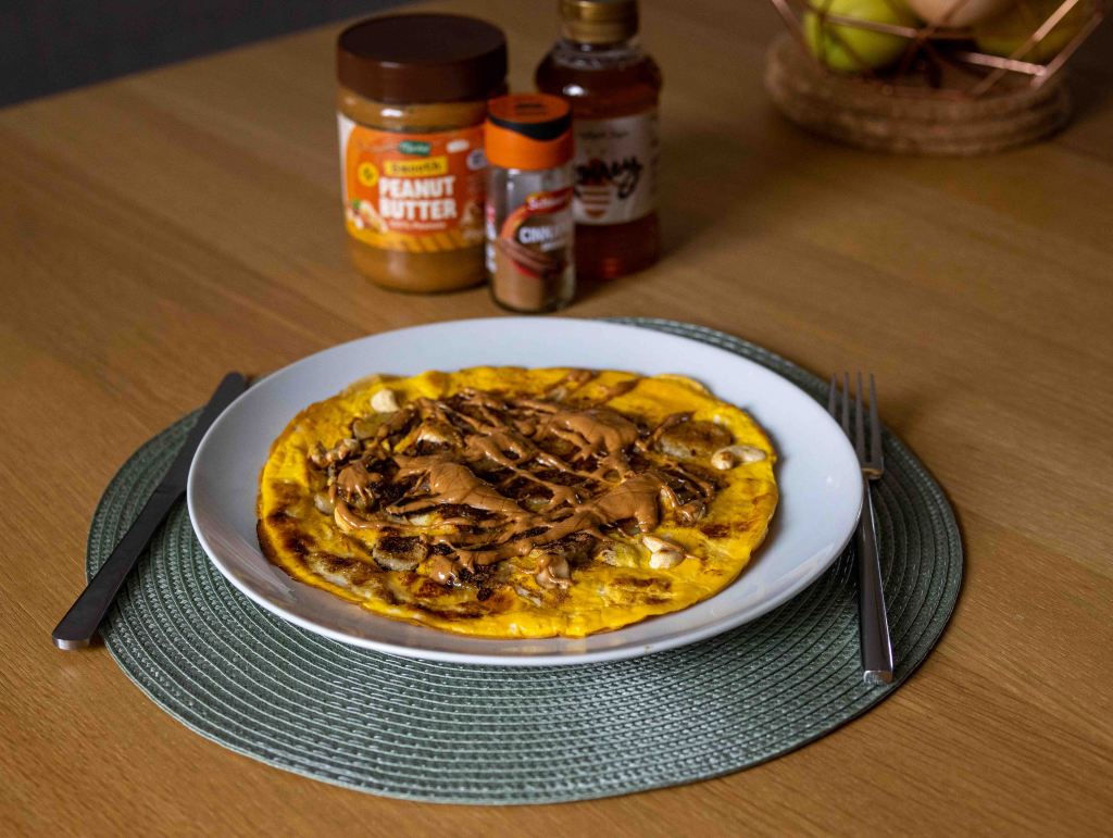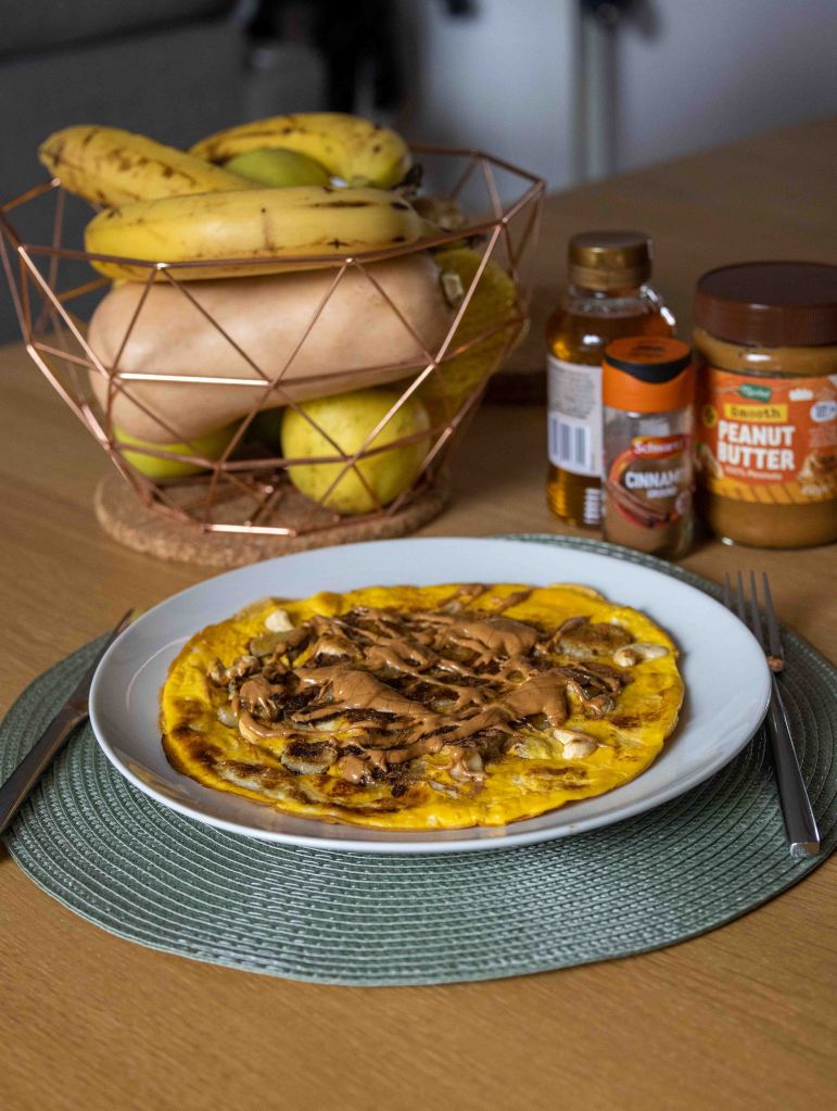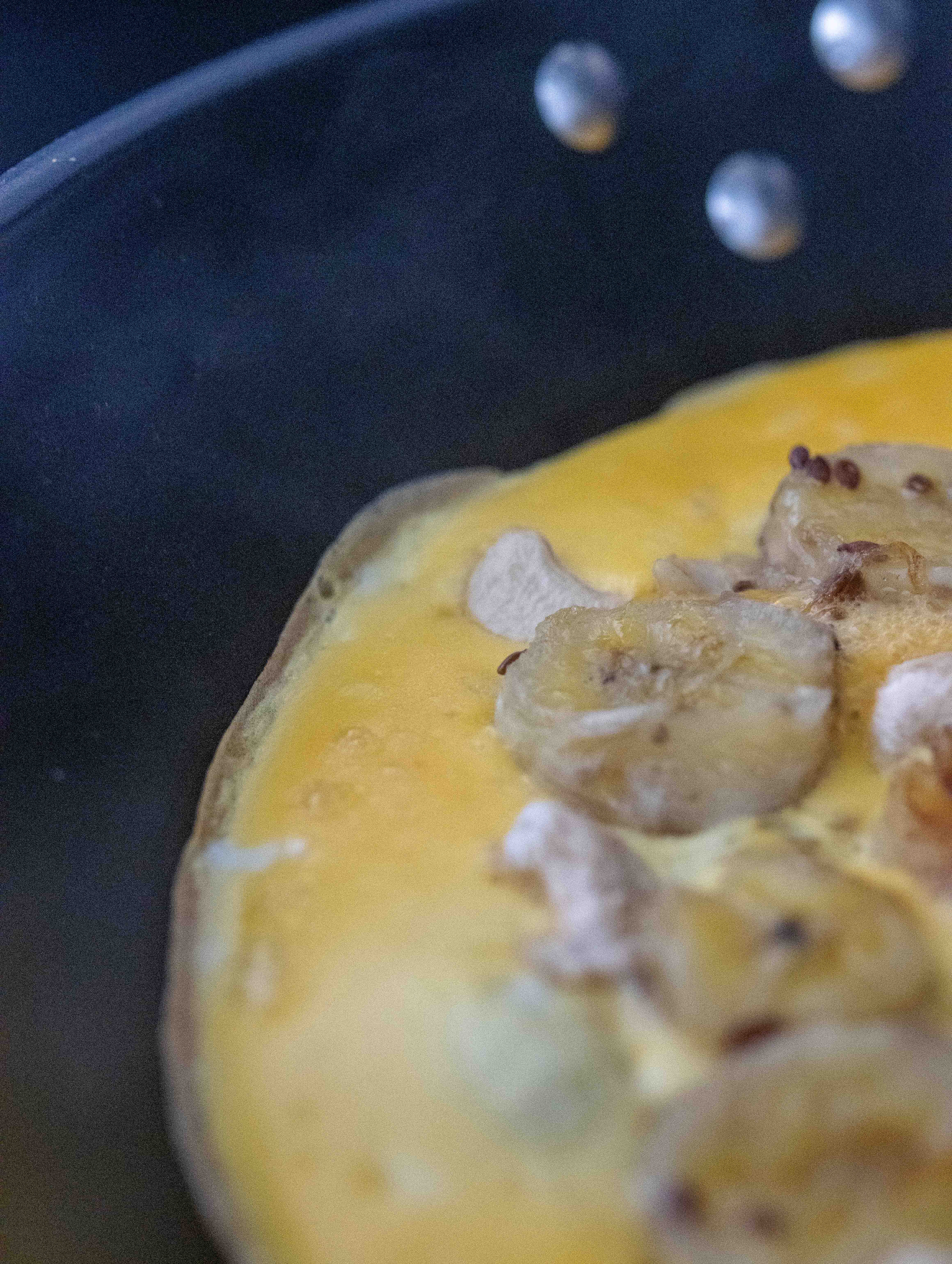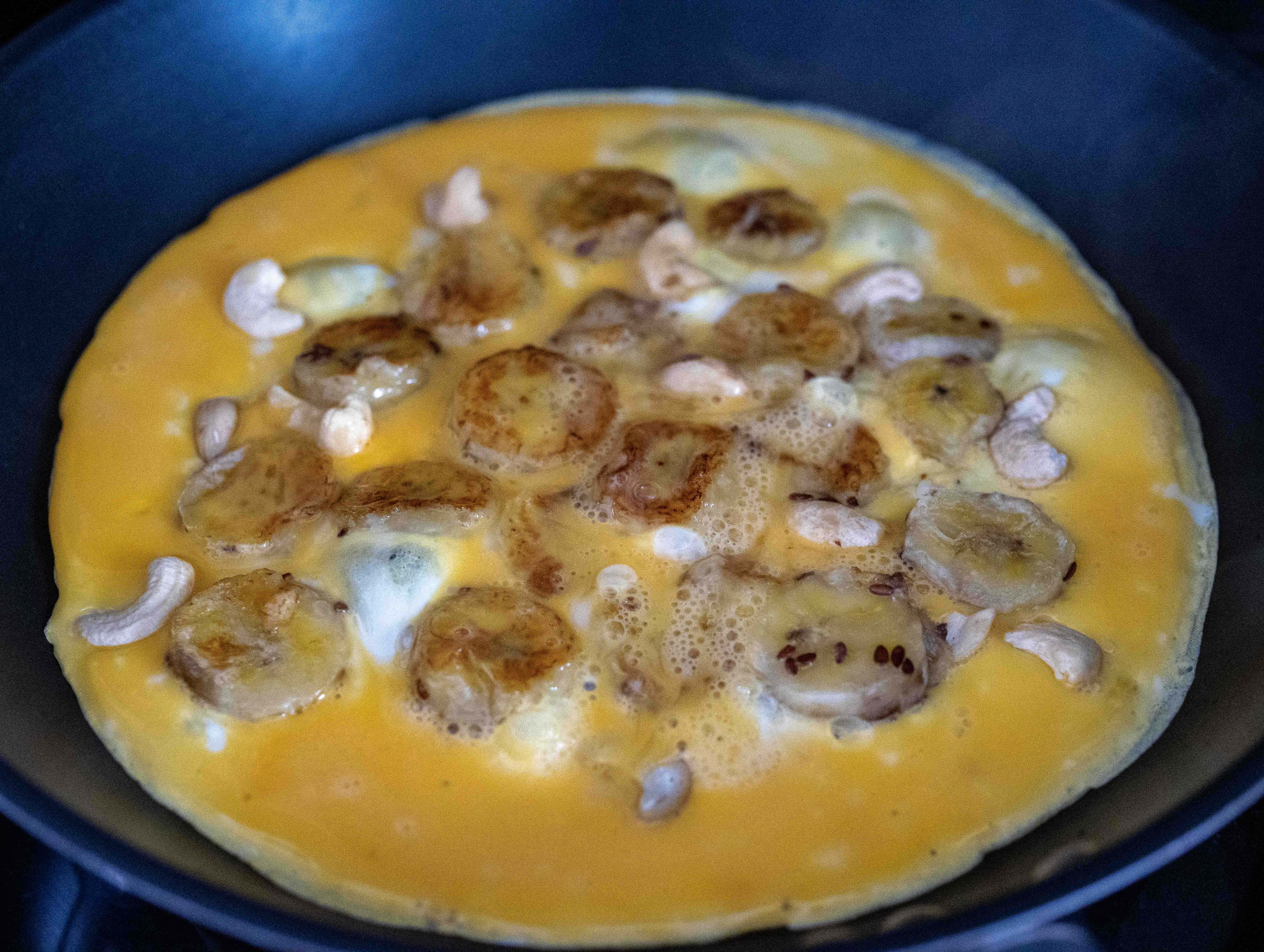 I have tried it with different fruits, apples, pineapple, and mango but somehow I find the banana version the best. Later will post some of the other versions. It is quite a simple recipe but the trick is to keep the omelet in one piece which can be challenging due to the fruit pieces.