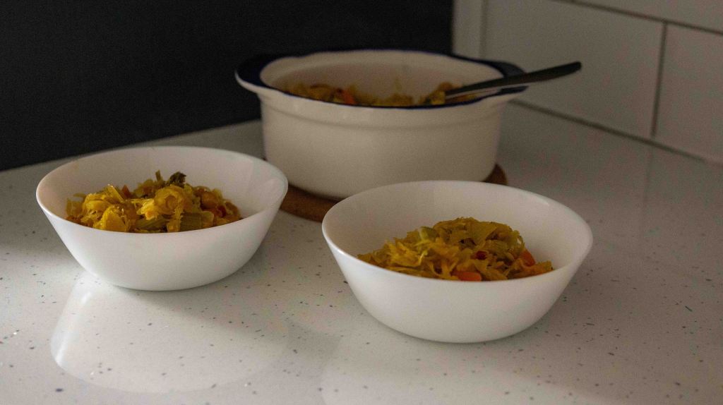 I love sauerkraut and last few months I had included it in my meals more often than before. It is a great source of vitamin K and is very tasty. I will try to prepare one by myself but for now will use a ready one. Usually, I make a salad with it and add something else but this time decide to make some kind of a meal and as I had chickpeas well this is how this recipe came about 🙂 Easy, quick, and tasty.