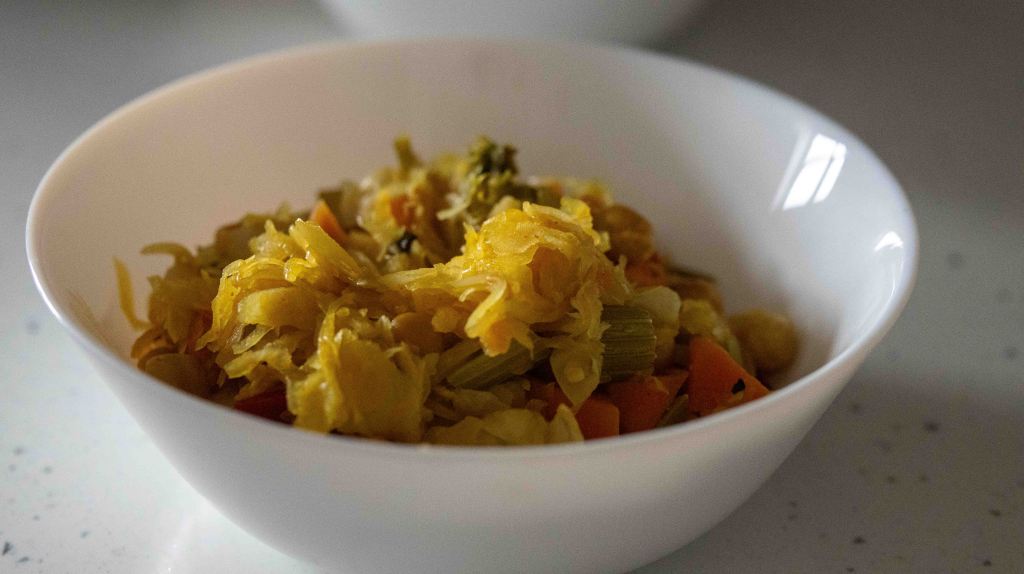 - Drain the chickpeas from the water and add it to the veggie mix together with the sauerkraut.