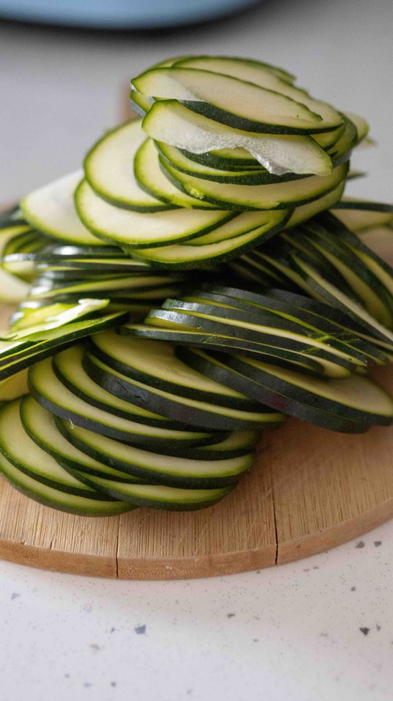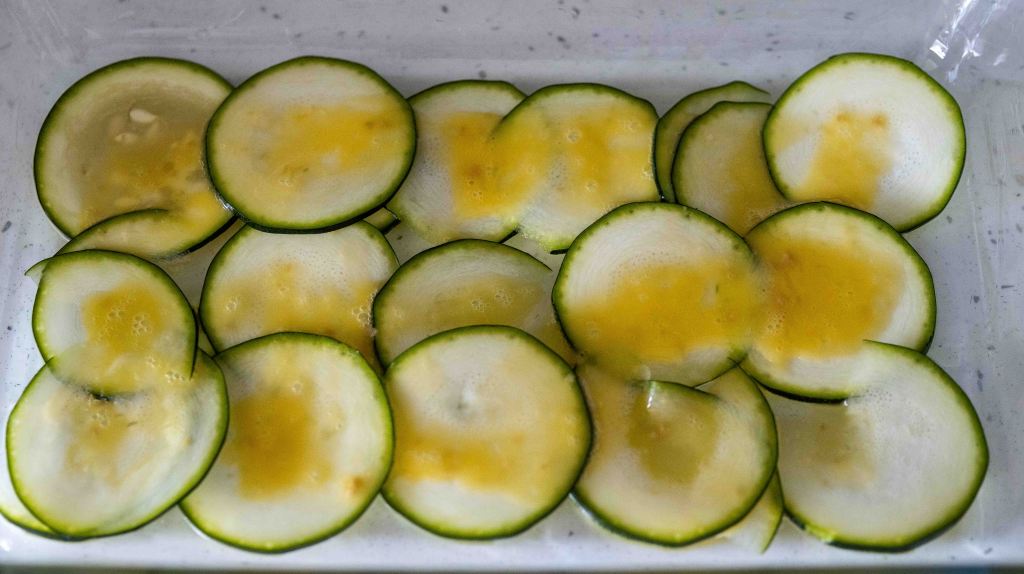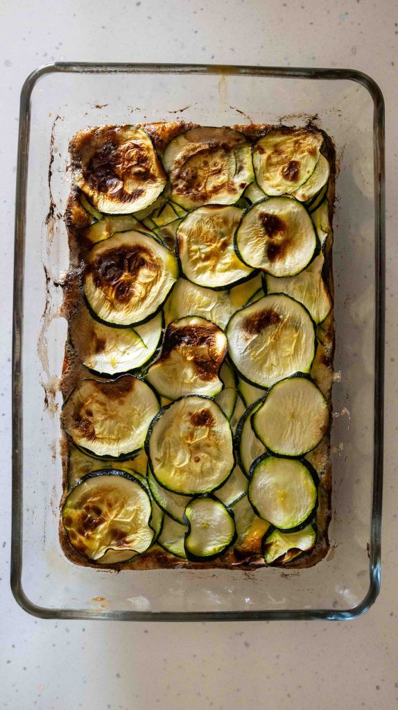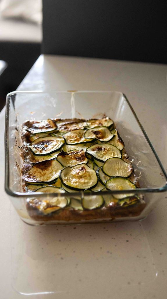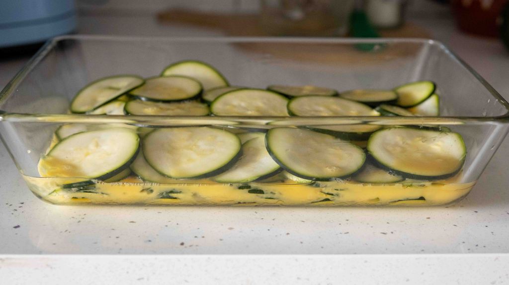 - Lay one row with zucchini – it doesn’t need to be slice by slice. You can put a couple of pieces so you have a solid base.