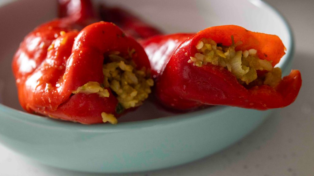 - Start filling the peppers, but leave a bit of room as the rice will increase its amount.
