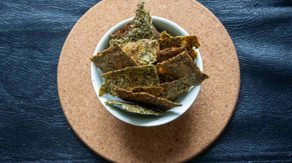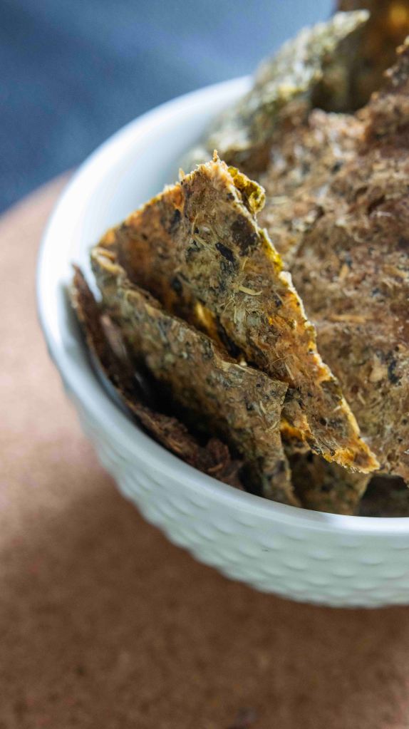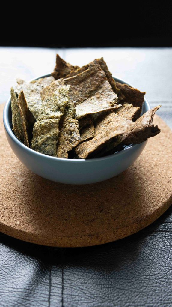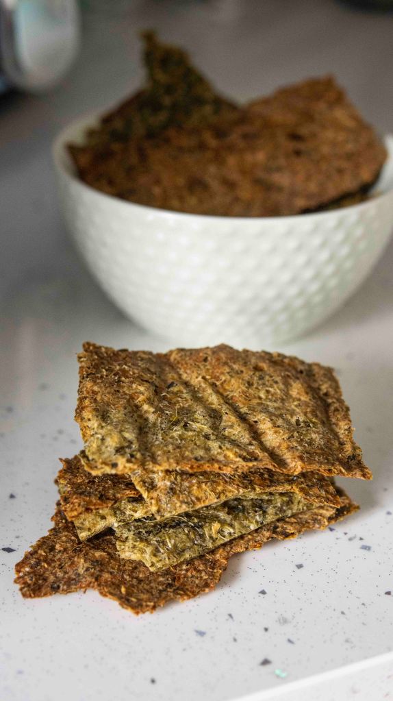 This cracker idea comes from having too much leftover frozen celery pulp. I was juicing celery and I froze the leftover pulp for soups or in this case for these snacks.