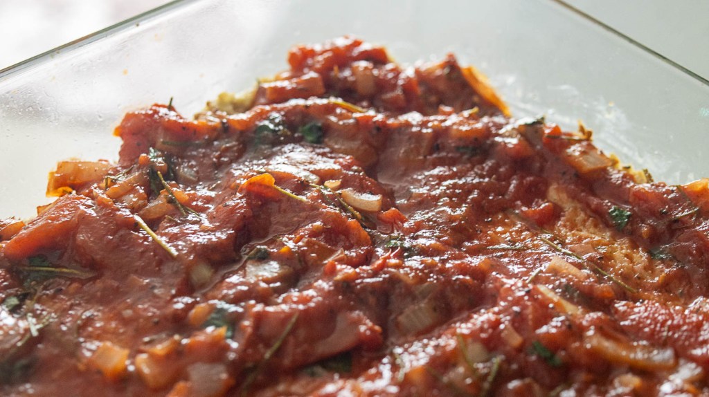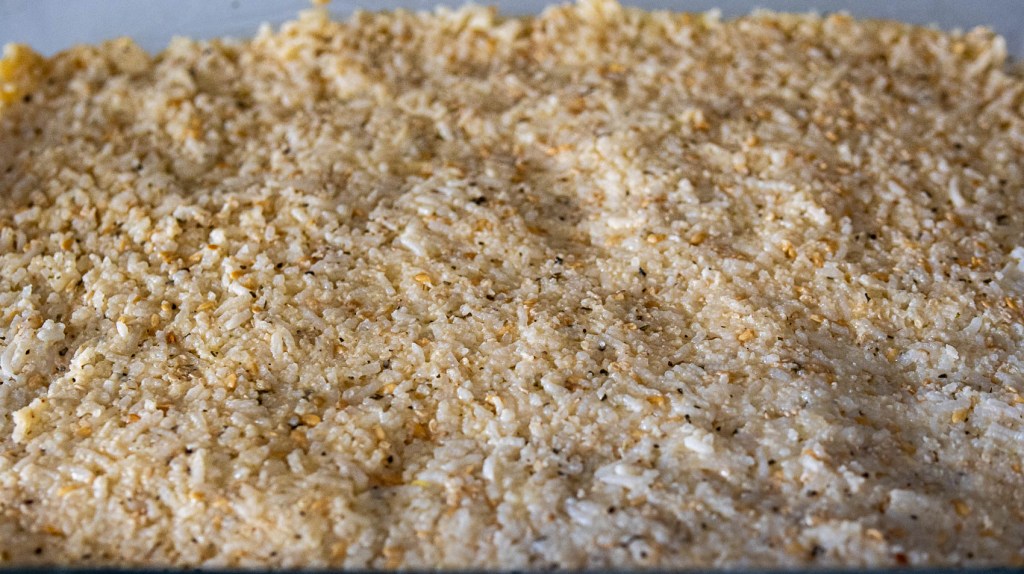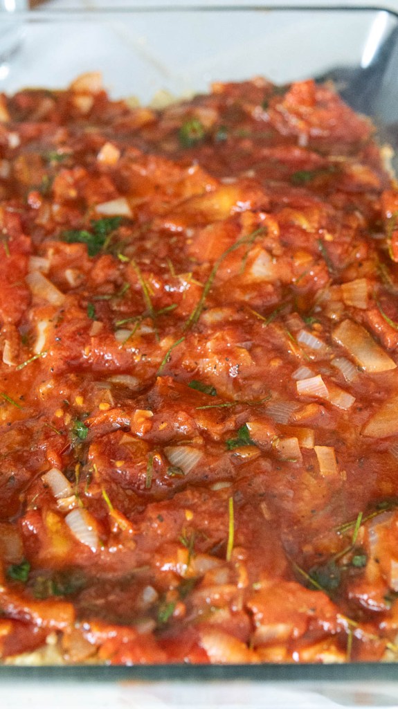 - When you notice that the rice starts to have a crust take it out and cover it with the tomato sauce.