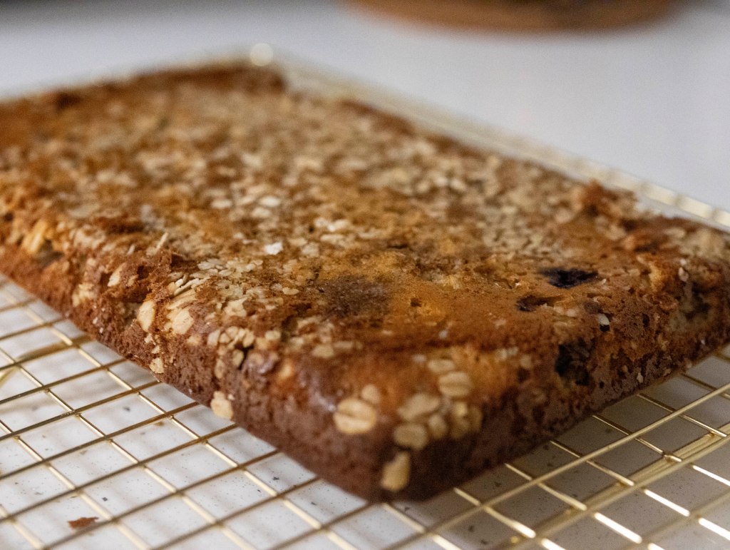 - Before transferring the cake mixture to a baking form, oil the baking form and cover it with oats slightly.
