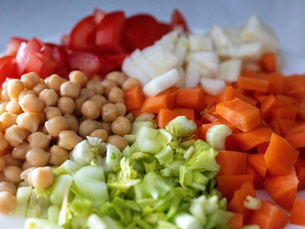 - I chopped a small onion, one clove of garlic, a carrot, and a tomato.