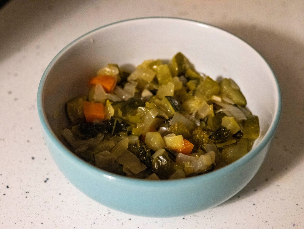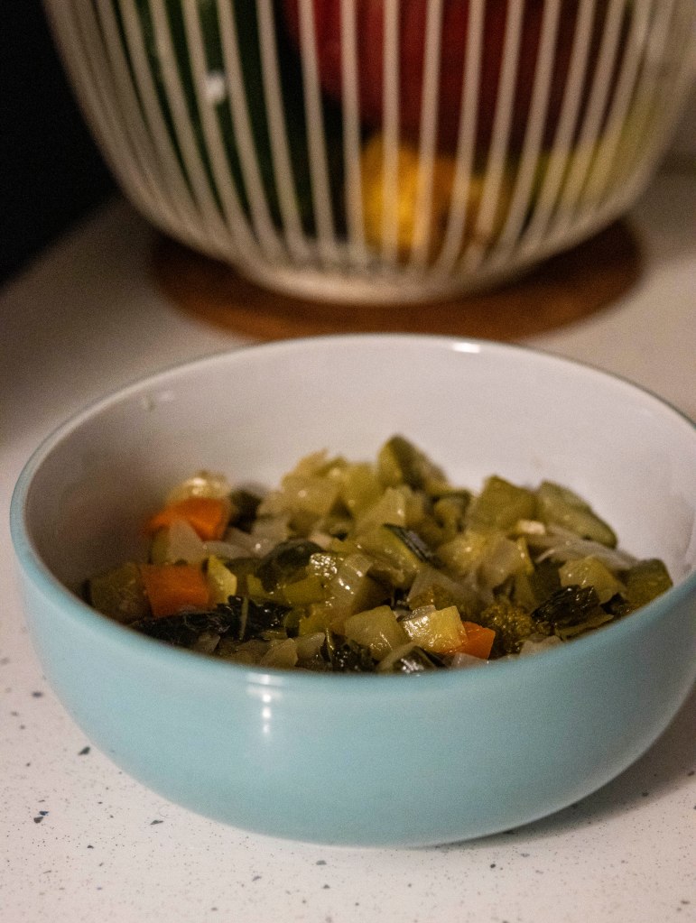 - Leave for a few minutes, until the veggies change their colors, all while mixing from time to time to prevent sticking to the bottom.